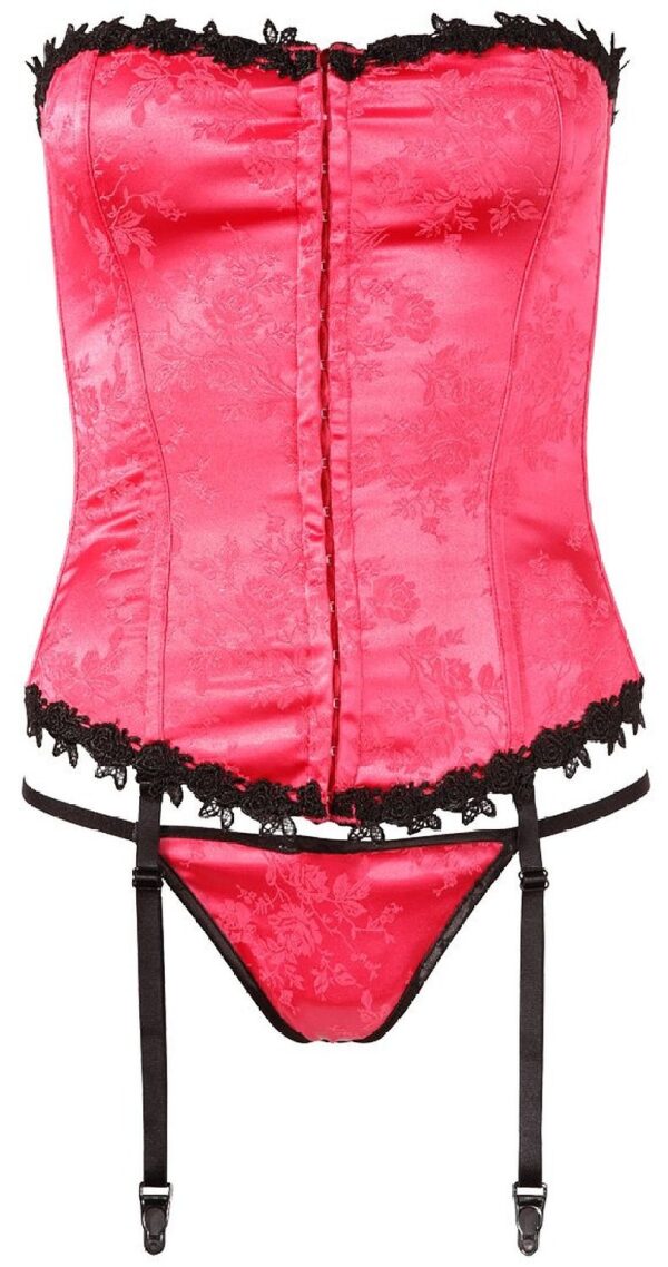 Attraente, provocante, burlesco! Corpetto fucsia con ricami neri sui bordi e allacciatura nera nella parte posteriore. Chiusura con gancio nella parte anteriore. Quattro stecche semi rigide per ogni lato a modellare la silhouette e migliorare la vestibilità seguendo le linee del corpo.