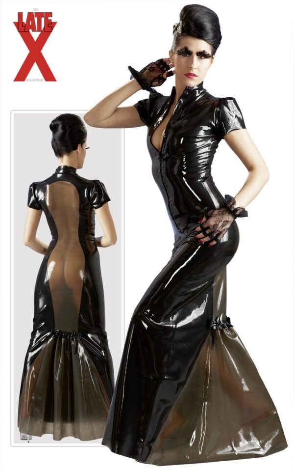Abito lungo in lattice con trasparenze, fornisce a chi lo indossa una silhouette a clessidra. Dispone di una cerniera sulla parte anteriore e la trasparenza nera fumè, sulla parte posteriore. Le maniche sono corte disponibile in tutte le taglie. .