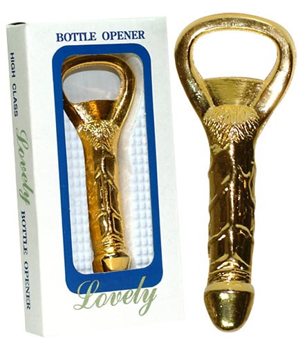 Simpatico apribottiglie a forma di pene realizzato in materiale metallico dorato.