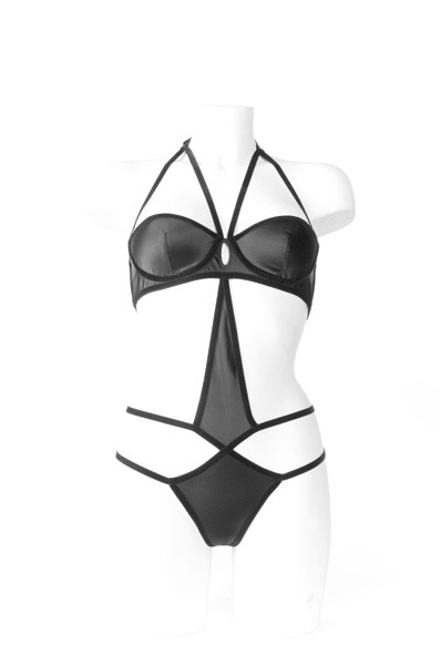 Stupendo body nero con corpo centrale a rombo con stringhe. Tutto unito da geometrie semplici e sensuali.