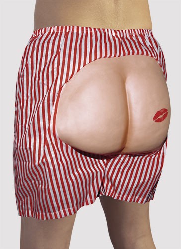 Boxer rigato rosso/bianco con culo baciato da labbra rosse. Un simpatico scherzo per i vostri addio …