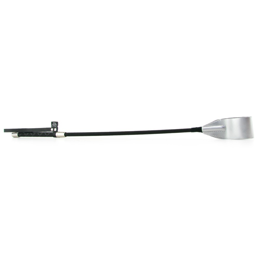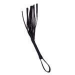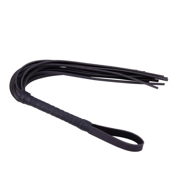 Frusta nera, tipo flogger, con più code dotata di impugnatura a intreccio e gancio per appenderla.