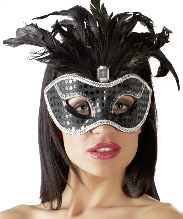 Maschera veneziana con gioco di luci di paillettes e decori lungo tutta la superficie. Una gemma dona un aspetto elegante mentre uno sfrazoso copricapo di piume garantisce un look raffinato e chic.