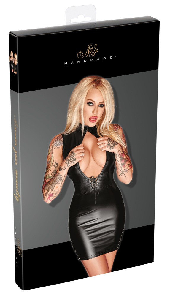 Effetto bagnato estremamente elastico (potente) realizzato in materiale nero opaco lucido. Abito con colletto alto e chiusura a gancio. Ampio taglio sul davanti. Allacciatura corta in vita e sull’orlo su ogni lato. Aderente. 80% poliammide, 20% spandex.
