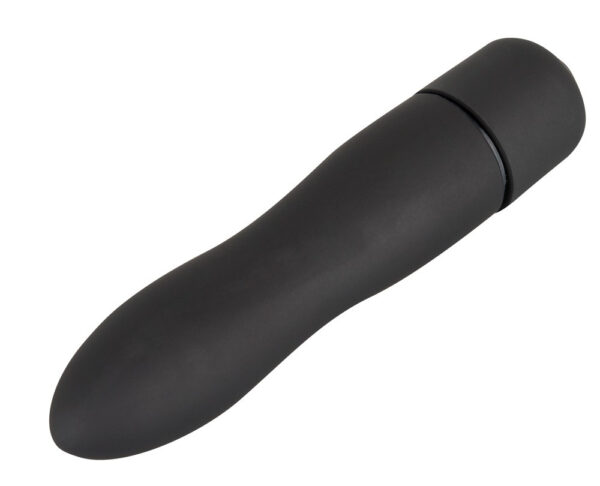 Mini vibratore nero opaco. Circa 8 cm di lunghezza, Ø 1,7 cm. Materiale: ABS con rivestimento in PU. Include batterie.