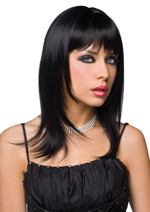 Parrucca realistica nera, con frangetta, liscia con punte leggermente in fuori. Ideale per essere indossata tutti i giorni.