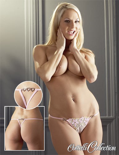 Perizoma con doppio ricamo floreale sulla parte anteriore in rosa e giallo. Piccoli strass presenti sul lato a forma di cuore. Lato posteriore di piccola forma triangolare. • Materiale: 100% poliestere.