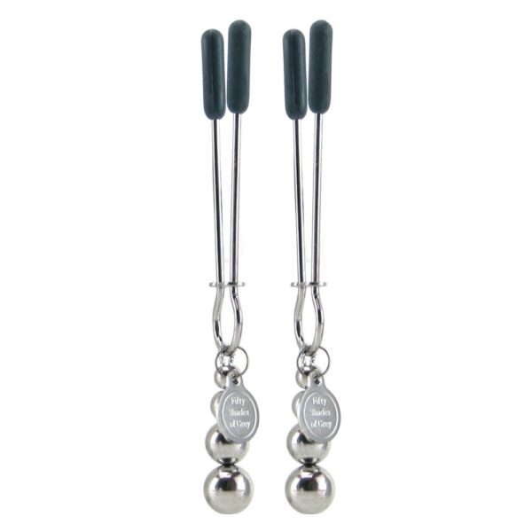 Set professionale di pinze per capezzoli con regolazioni ed estremità ricoperte in morbido silicone. Dalla serie ufficiale di 50 sfumature di grigio, un gioco di dolore misto a piacere, intenso piacere. Due pesetti posti alle estremità della catena garantiscono vibrazioni più intense dovute al momento per un’impennata della sensibilità del capezzolo e del piacere.