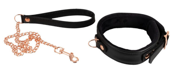 Collare e guinzaglio in un set di Bad Kitty. Il colletto e il passante per il polso sono in similpelle nera. Il guinzaglio ha una catena color oro rosa. Il colletto ha un morbido peluche all’interno e c’è un anello nella parte anteriore dove è possibile attaccare il guinzaglio incluso. Il colletto ha anche una chiusura con fibbia in modo che la circonferenza possa essere regolata da 30 a 40 cm. Guinzaglio a catena con moschettone (senza passante da polso) lungo 65 cm.