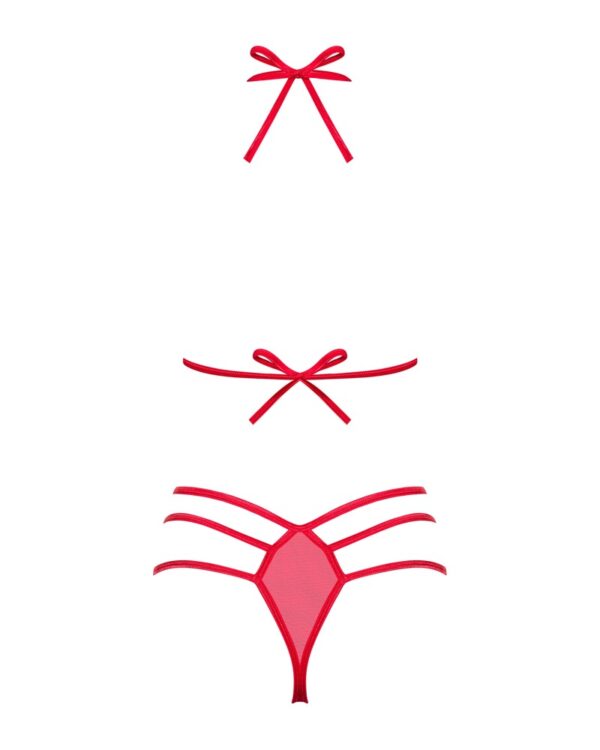 Set Giftella rosso di Obsessive con reggiseno e perizoma morbidi. Materiale elasticizzato morbido e semitrasparente con un elegante look a spalline e fiocchi decorativi. Reggiseno con collo alto e fiocco da annodare sulla schiena.