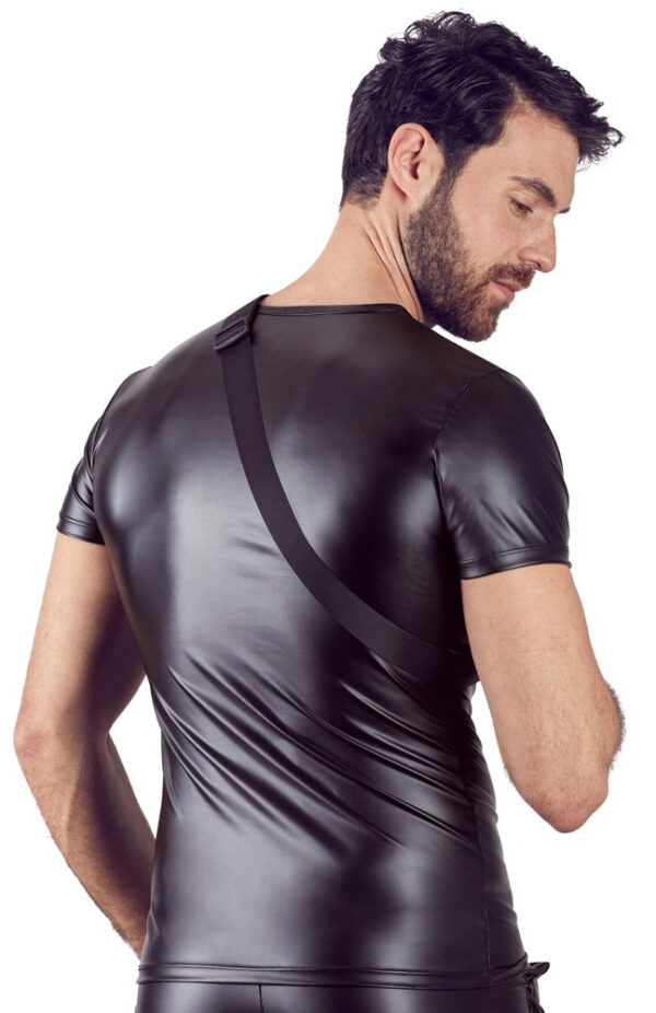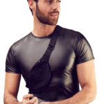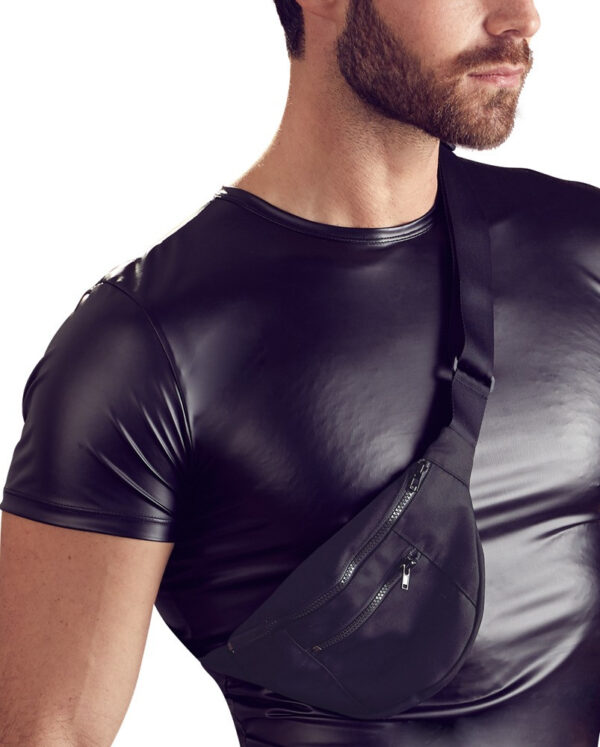 Un uomo avrà tutto con sé se indossa questo vestito: una camicia che valorizza la figura in un aspetto opaco con un marsupio cucito che attraversa il petto.