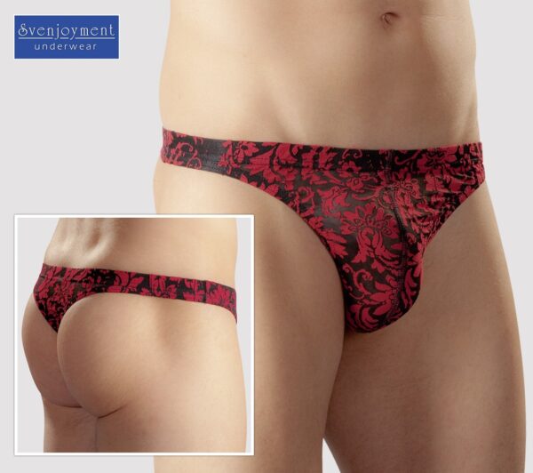 Slip uomo “Ornament” XLTessuto a rete trasparente con nobile disegno floreale devoré. Nero / rosso. 54% poliammide, 38% cotone, 8% spandex.