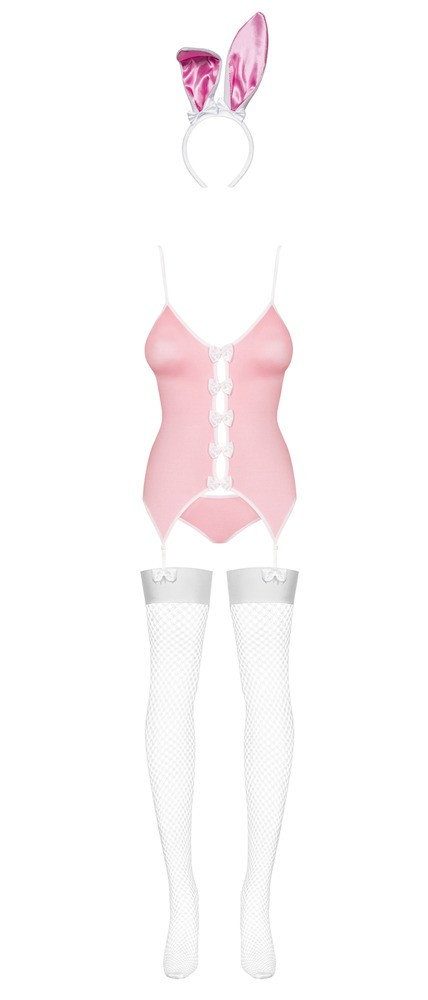 Basco rosa chiaro con bordo bianco. La parte anteriore aperta è chiusa da graziosi fiocchi bianchi. La parte posteriore del basco affascina con l’allacciatura fantasia. Include slip abbinati con una soffice coda bianca e un cerchietto con orecchie da coniglio. Senza calze.